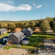 Działki każdej willi wydzielone ogrodzeniem; przy podjazdach indywidualne miejsca do segregacji odpadów.