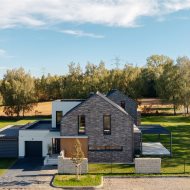 Wykończenie: tynk silikonowy BAUMIT, okładziny drewnopodobne ULTRASHIELD, płytki klinkierowe INTERBAU BLINK, blacha PREFA na rąbek stojący.